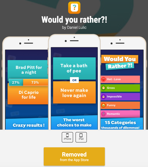 App Advice. (2018, August 24). Would You Rather?! by Daniel Lulic. Retrieved from AppAdvice: https://appadvice.com/app/would-you-rather/1149281412